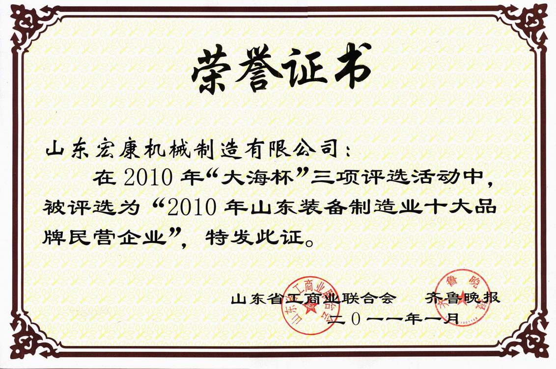 1月16日,由山東省工商業聯合會、齊魯晚報共同舉辦的2010年“大海杯”“山東民營企業100強”、“山東(行業)十大品牌民營企業”、“山東最具發展潛力民營企業”三項評選活動揭曉, 我公司被評為“山東省裝備制造業十大品牌民營企業”。