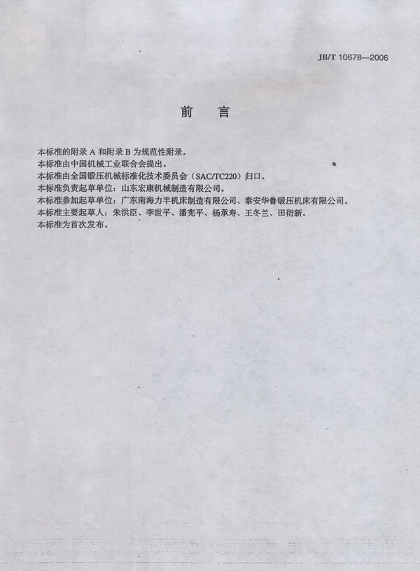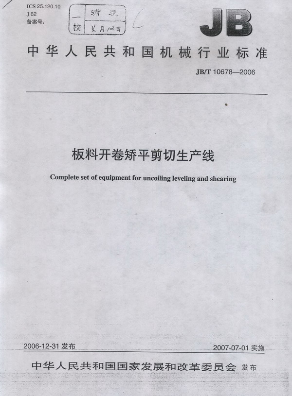 國家發(fā)展和改革委員會發(fā)出公告(2006年 第 97 號):正式批準由我公司主持起草的“板料開卷矯平剪切生產(chǎn)線”的行業(yè)標準(標準號JB /T 10678-2006),并于2007年7月1日實施。 本標準的制訂歷時十八個月。公司成立了標準制訂訂工作小組,調(diào)訪了國內(nèi)多家科研單位、同行業(yè)、用戶,并邀請他們來公司共同參與分析討論,于2005年6月形成最終報批稿。本標準是國內(nèi)鍛壓行業(yè)第一部對整條生產(chǎn)線進行規(guī)范的標準,其技術(shù)水平已達到或超過國外現(xiàn)有標準。